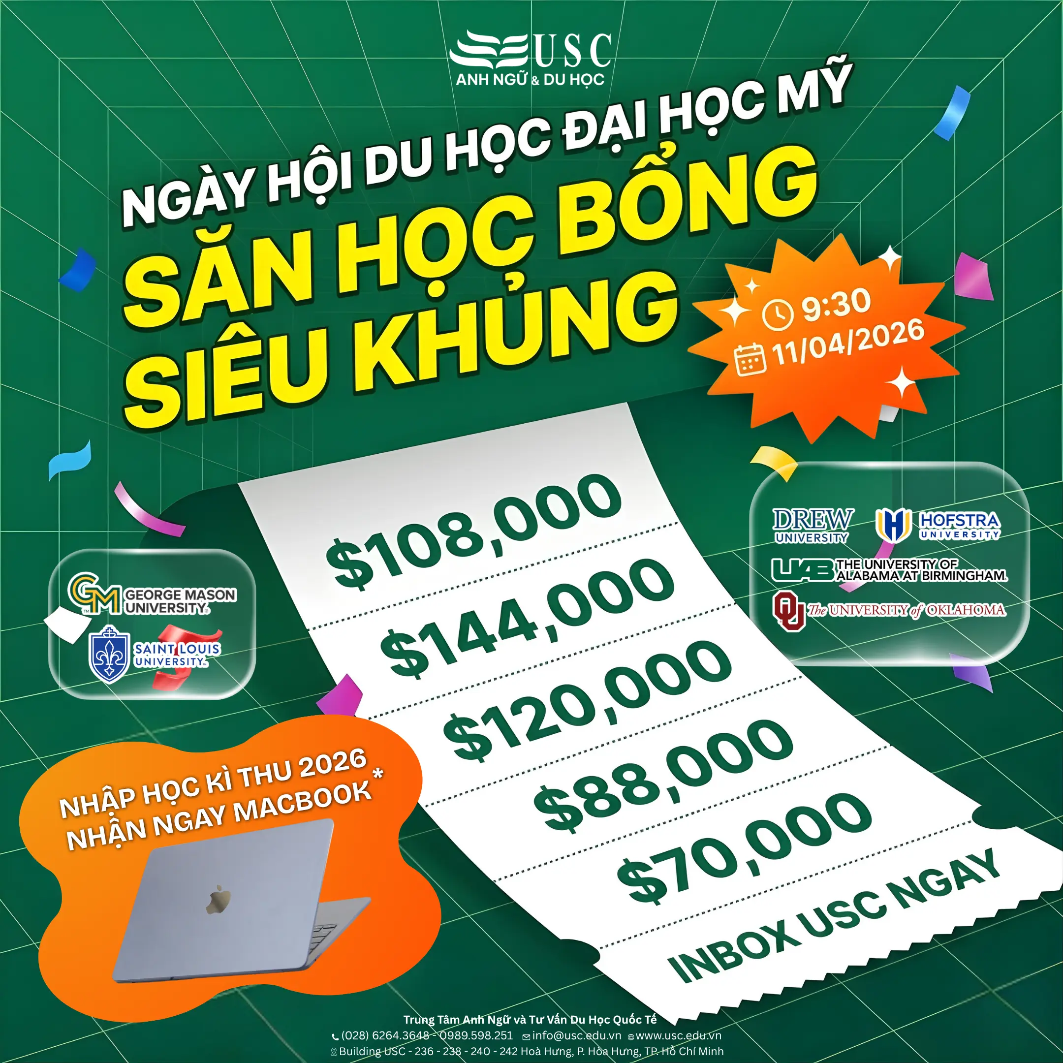 • Học bổng lên đến $144,000 từ các trường danh tiếng: Suffolk, Saint Louis, Oregon State, Hofstra, UAB...