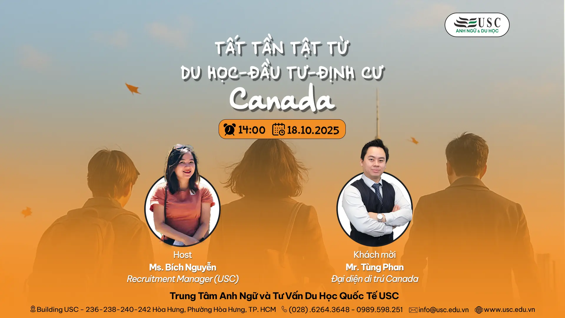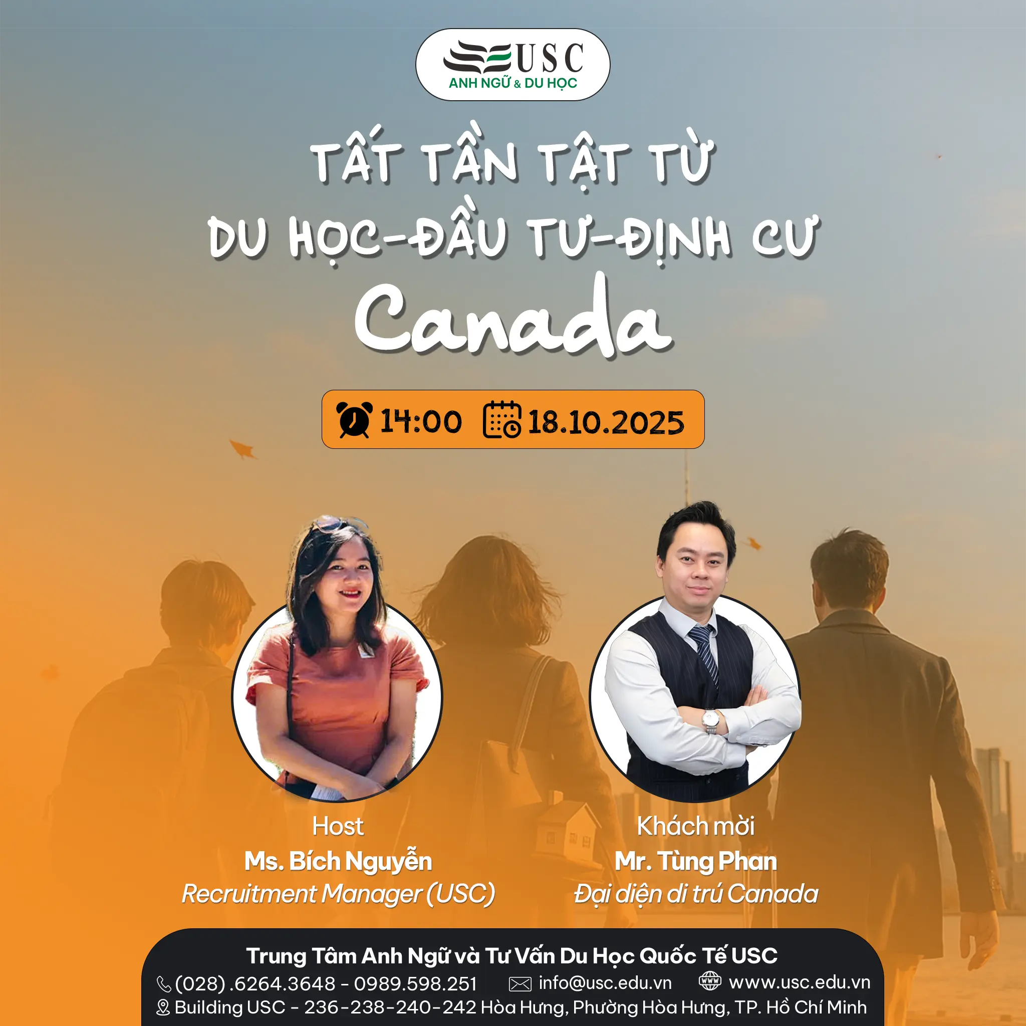 Mời quý phụ huynh, học sinh tham dự sự kiện và nhận tư vấn trực tiếp từ khách mời đặc biệt Mr. Tùng Phan – Đại diện di trú Canada – tại văn phòng USC để được: